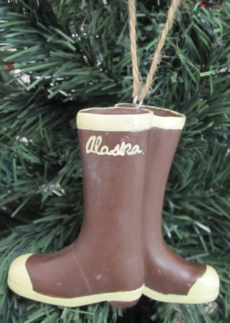 Just about every local owns a pair of “Tuff” rain boots, this keepsake ornament was made to celebrate our unique Alaskan style. 3″ tall